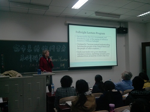 Jane Hunter女士首先向我们介绍了富布莱特讲座项目,这个项目创建于1946年,是中美两国间重要的教育交流项目,目的是加强教育文化交流,加深国家间的相互了解,尤其对于中美大学生来说更是一个互相了解的绝佳平台。