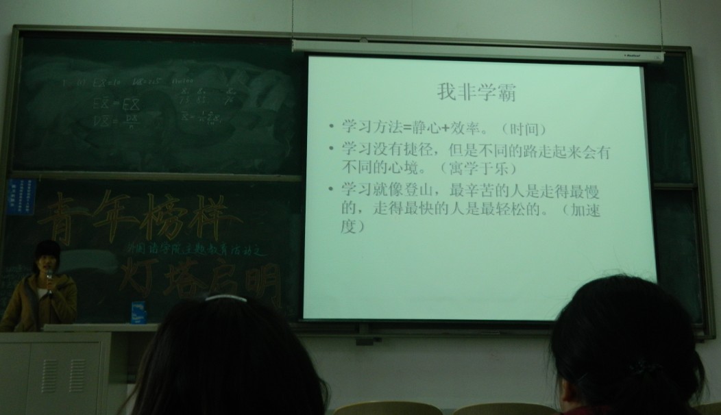 本次活动旨在以优秀学子为榜样,培养“严谨勤奋,乐观向上”的学风,促进自身全面发展,因此本次会议邀请了获“国家奖学金”、“国家励志奖学金”和“全面发展奖学金” 的同学分享他们的学习心得。何庆,赵雄斌,黄鑫磊,方灏,钱烨芳和赵阳通过讲述他们的学习方法,从不同的课堂上了解不同的文化,同时根据课程要求,有针对性的进行复习。除了学习之外,他们还向同学们介绍他们平时参加的一些社团活动,通过参加不同的社团活动,扩大自己的交际圈,取他人之长,补己之短。