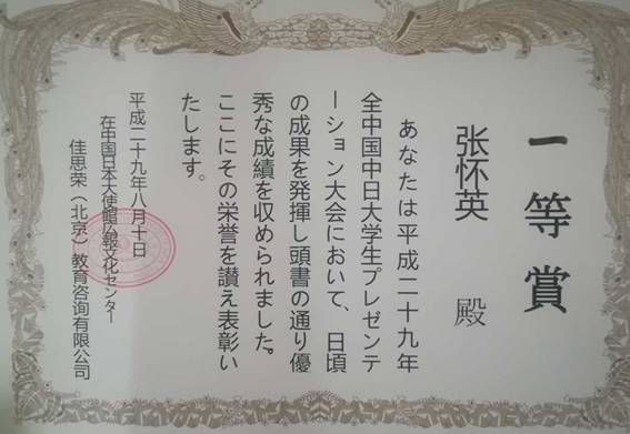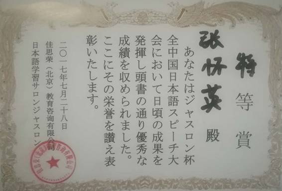 7月28日举办的佳思荣杯日语演讲比赛,共有来自全国各个高校80多名选手参赛,我校选手张怀英同学就“恋人与家人的生日会在同一天时的选择”主题进行演讲,荣获优胜奖。8月10日驻京日本大使馆会场举办的全国日语演讲比赛,共有全国各个高校200多名选手参赛,张怀英同学及所在团队的演讲内容诙谐幽默、形式丰富多彩,赢得了观众和评委一致赞赏,最终获得一等奖荣誉。