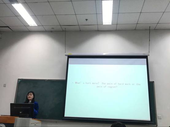 最后上场的15级英语专业的石晴学姐,大四的她刚刚收到世界常春藤名校哥伦比亚大学公共管理专业硕士的录取通知书。石晴学姐讲述自己是怎样发掘对英语的兴趣,从《哈利波特》到《简爱》再到世界级名著,她通过不断地阅读提升了自己的英文水平和素养。此外,她也讲述了积极参加我校的很多社团活动来拓展自己的眼界和人脉的经历,用自己的亲身经历告诉同学们,大学生活是丰富多彩的,注重学习的同时也要培养平衡自己其他方面的能力。