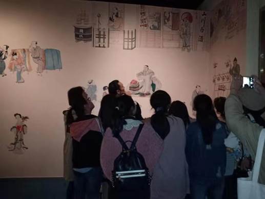 下午两点左右,我们有序进入到此次展览所在的二号展厅。刘峰老师担当了解说员,生动有趣且干货满满的讲解吸引了很多参观者与我们同行。展品以绘画作品为主,也有一些实物陈列。刘峰老师通过直观的展品实物,讲授了相关的日本文化知识。同学们不仅了解到老北京的民俗文化,还同时了解了日本力士、歌舞伎、传统服饰、生活习俗等内容。
