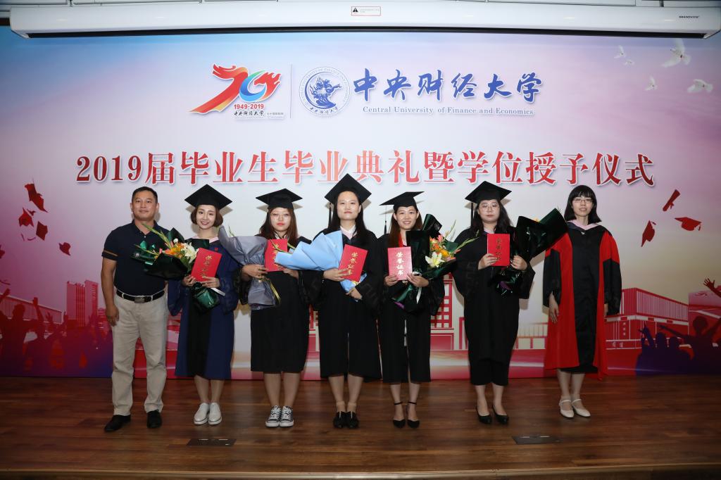随后,校友代表、2008级本科生、北京中财龙马资本投资有限公司投资总监、研究员的商升送上真心祝福与鼓励之后,毕业典礼进入表彰环节。由刘峰老师宣读名单,王珊珊老师为市校两级优秀毕业生颁发荣誉证书。由李名义宣读名单,李丽老师为受聘校友大使的毕业生颁发了聘书,为自主创业的毕业生颁发荣誉证书。