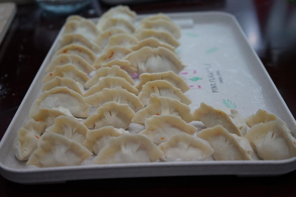 大家一边忙碌一边围绕着学习生活工作等方面一起交谈,在包饺子活动期间,面粉飞扬、欢声笑语、其乐融融。四大盆肉馅,在大家的共同努力下,很快变成了一盘盘美观饱满的饺子。