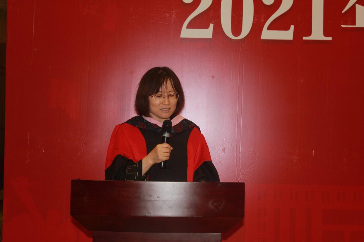 英语系主任王珊珊作为教师代表寄语全体毕业生。王老师围绕着对于毕业生的景愿与期待,表达了对于同学们优秀品质和学习能力的认可。同时,王老师也真诚地提醒了各位同学对于“失败”一词的理解,认清成功的不易之后,也要更加明确的去努力和奋斗,在反复磨练当中,各位的信念才会愈发坚韧。“阅读”也同样是实现人生意义的重要途径,保持学习,保持上进,在今后的人生道路上,努力做出成绩,走向精彩。