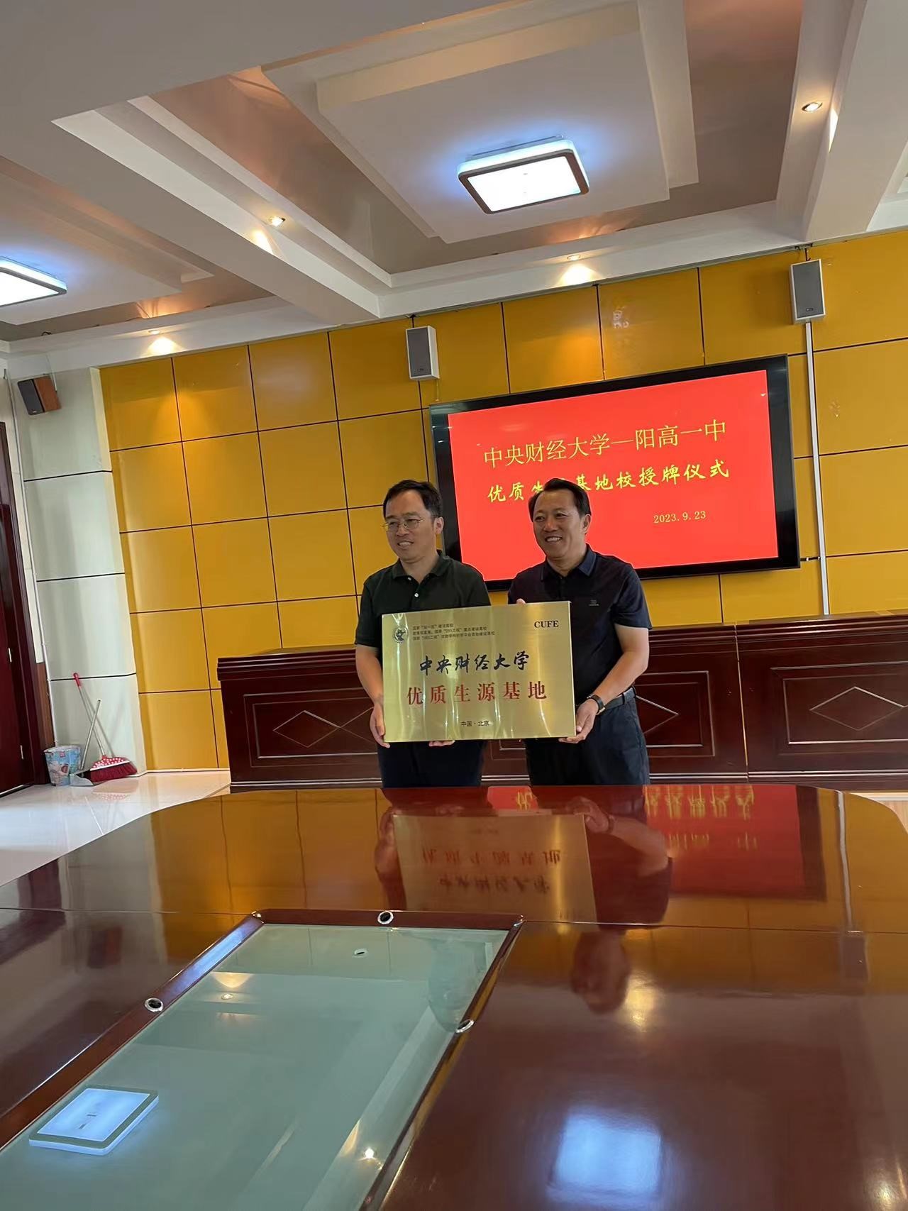 为持续提升我校在山西省的生源质量,吸引更多三晋优秀学子报考中财大,9月24日上午,学院党委书记冯俊波专程赴山西省阳高县第一中学校进行招生宣传,并举办“中央财经大学优质生源基地”签约暨授牌仪式,山西阳高一中校长孙玉河、副校长曹东亮等出席活动。