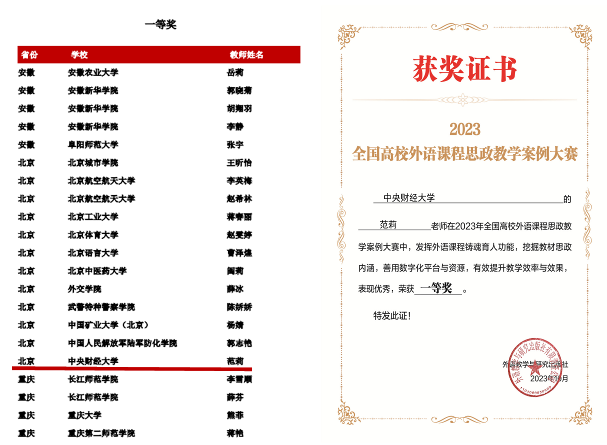 近三年来,范莉教授以讲授课程为抓手,以教学改革为动力,获得了与课程思政相关多项校内外研究与教改项目,校内项目如校级一流本科课程建设项目(2023-)、校级时雨微课项目(2020)、校级研究生教育教学改革研究项目(2023-)、校级研究生在线开放课程项目(2023-)、校级研究生课程思政项目(2020-2021)等。这次她在全国专业竞赛中获奖,也是学院在学校领导下,以“为党育人、为国育才”为指引,高度重视师资建设,深度开发“语言+财经”人才培养模式潜能,精心培育一线课程,大力提升教学教改质量,将“三进”工作做实、做好、做出特色的体现。