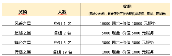 全国阶段奖项:所有参与的选手将被授予“中国故事精彩讲述者” 称号,并用个人奖项做差异区分排名前 1、排名前 2~3、排名前4~6 以及第 7~25 名的选手。