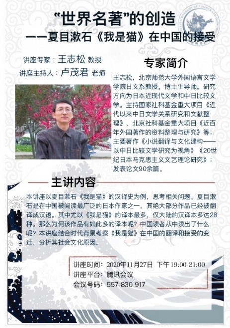 2020年11月27日晚7点,“‘世界名著’的创造——夏目漱石《我是猫》在中国的接受”专题讲座通过腾讯会议平台举行。本次讲座由北京师范大学王志松教授主讲,leyu乐鱼·官方web站登录入口副院长卢茂君老师主持,日语系李炜老师、李凝老师、李蕊老师及40余名同学参与了讲座。