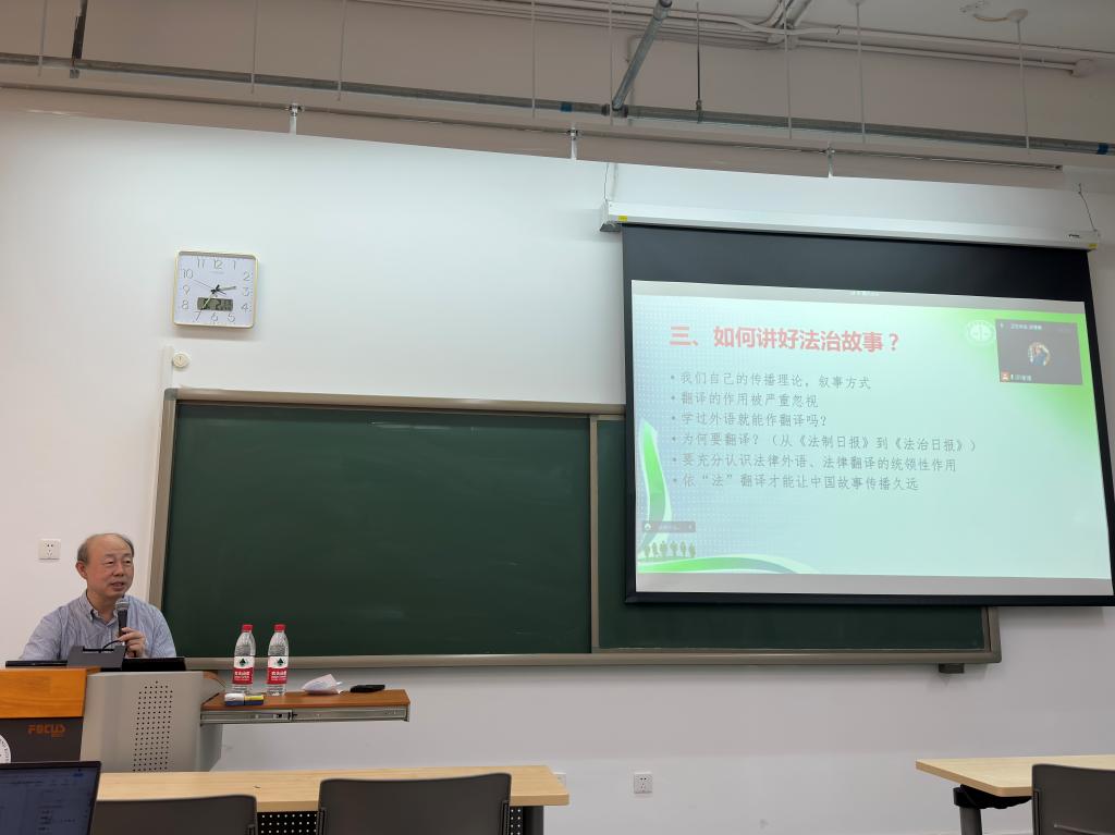 张法连教授在讲座开始就引用了习近平总书记的话:“讲好中国故事,传播好中国声音,展示真实、立体、全面的中国,是加强我国国际传播能力建设的重要任务。”之后张教授分析了我国当前的国际传播工作中到底存在哪些问题,并对新时代背景下的法治翻译做了分析,并列举了案例,引起同学们阵阵掌声。