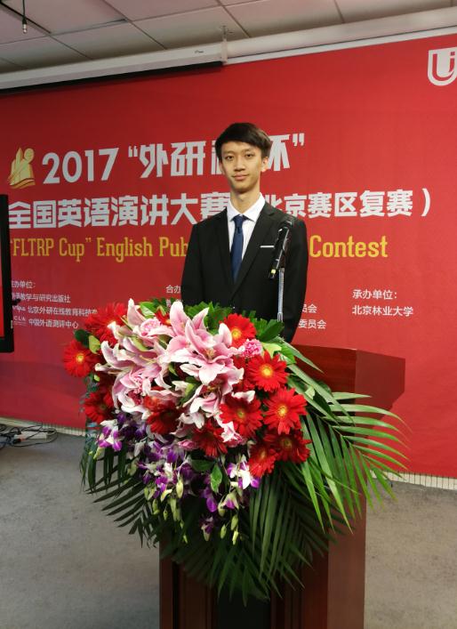 2017年10月28日“外研社杯”全国英语演讲大赛(北京赛区)在林业大学举办。包括清华大学、北京大学、北京外国语大学等在内的46所在京高校,共46名选手参加了比赛。行政管理16班的李昊恩在之前的校园选拔赛中凭借敏捷的思维和清晰的逻辑脱颖而出,代表我校参加了这次比赛。